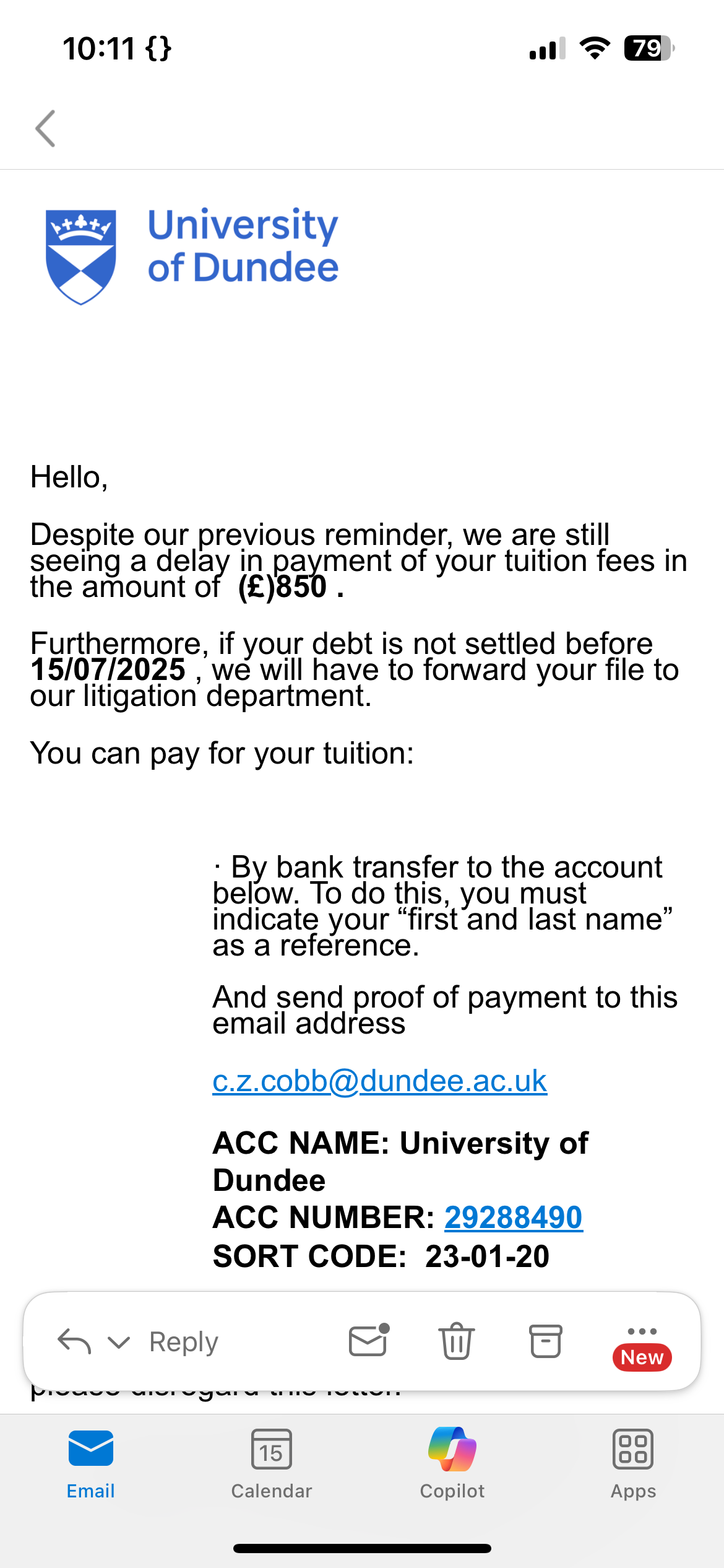 WaterCoFire 此发件人为 2554402@dundee.ac.uk 主题为 UoD Outstanding Payment. 的邮件要求您于 7/15 日前缴纳 850 镑学费至指定账户,否则将诉诸法务部门 这是诈骗邮件,不要相信捏,DIICSU 学费缴纳永远是从中南教务系统,来自邓迪大学的消息也永远是从官方邮箱发出,绝不是一个 Student 邮箱。如是学生会消息,也请认准 @dusa.co.uk 尾缀 thx
